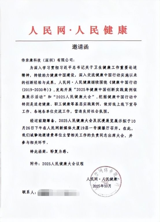 近日,侍親康科技(深圳)有限公司收到來(lái)自人民網(wǎng) · 人民健康 的正式邀請(qǐng)函,受邀出席于2025年10月26日在北京舉行的"2025 人民健康大會(huì) " 。此次大會(huì)是健康中國(guó)建設(shè)領(lǐng)域的重要盛會(huì),侍親康科技的入圍標(biāo)志著企業(yè)在健康老齡化領(lǐng)域 的創(chuàng)新實(shí)踐獲得了國(guó)家級(jí)媒體與行業(yè)專家 的高度認(rèn)可。