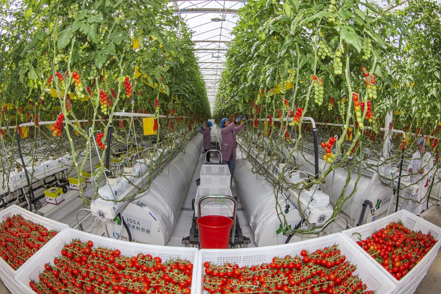 無土栽培,水肥滴灌,一串串水果番茄水靈靈、紅彤彤。近日,記者來到江蘇邳州市戴圩街道的綠色生態(tài)水果番茄項目基地,在一處上萬平方米的玻璃溫室內(nèi)探尋當(dāng)?shù)剞r(nóng)業(yè)新質(zhì)生產(chǎn)力。溫室內(nèi),番茄栽培架整齊排列,秧苗植根于一塊塊巖棉里,技術(shù)人員根據(jù)植株不同階段的生長需要調(diào)整營養(yǎng)配方。據(jù)邳州金水杉農(nóng)業(yè)科技有限公司生產(chǎn)技術(shù)部總監(jiān)程勝利介紹,這里采用了國際先進(jìn)的普瑞瓦溫室中控系統(tǒng),可以實現(xiàn)水、肥、溫、光、氣等100%智能化調(diào)控。值得一提的是,一只只熊蜂穿梭在枝頭間,它們厚重的絨毛攜帶的花粉量是普通蜜蜂的三倍,由此成為助力番茄生產(chǎn)提質(zhì)增效的“授粉神器”?!爸腔坜r(nóng)業(yè)帶來的不光是產(chǎn)量保障,更重要的是口感自然?!背虅倮f,每株水果番茄的生長周期為1年,期間能長出約50串果實,基地目前每天采收量在6-8噸。據(jù)了解,該公司種植園規(guī)模達(dá)700多畝,項目一期帶動當(dāng)?shù)?50多人就業(yè),二期、三期建成后預(yù)計能帶動約500人就業(yè)。作為國有控股企業(yè),它還通過提供種苗、技術(shù)指導(dǎo)和銷售渠道,帶動一批農(nóng)戶增收致富、共享發(fā)展紅利,形成了從生產(chǎn)到銷售的現(xiàn)代農(nóng)業(yè)產(chǎn)業(yè)鏈閉環(huán)。