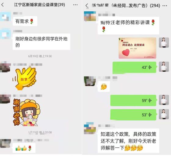 本次活動(dòng)由江寧區(qū)婚姻輔導(dǎo)室汪友琴老師通過語音講解、互動(dòng)咨詢、在線調(diào)查三個(gè)環(huán)節(jié)進(jìn)行在線開展,婚姻登記中心有效利用網(wǎng)絡(luò)力量和社會(huì)組織現(xiàn)有資源,通過技術(shù)手段鏈接江寧區(qū)十多個(gè)社區(qū)上千人群體進(jìn)行有效宣傳新政策。
