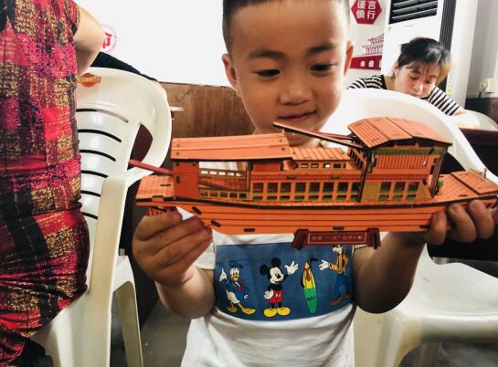 木質(zhì)船板散發(fā)著淡淡木香,古樸莊重,一看就是縮小版的“南湖紅船”。 “紅船精神”既是一種信仰,也是一種精神寄托。接下來的手工制作環(huán)節(jié),孩子們用手工造船的方式回顧黨的百年奮斗史,汲取黨的精神力量。隨后,小朋友們紛紛開始進(jìn)行手工制作。志愿者耐心指導(dǎo),孩子們相互合作,拼裝、粘貼……大家以“紅船”為原型,努力將一塊塊“零件”組裝起來,不一會(huì)兒一艘艘紅船便呈現(xiàn)在大家面前。