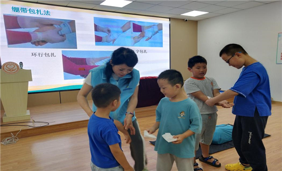在急救知識培訓(xùn)環(huán)節(jié),劉老師給大家做了關(guān)于“如何撥打120”、“止血包扎”、氣道異物梗阻急救和心肺復(fù)蘇術(shù)相關(guān)知識的培訓(xùn)。在止血包扎培訓(xùn)環(huán)節(jié),劉老師請小朋友上前示范,分別扮演救助者和受傷者,悉心指導(dǎo)包扎細(xì)節(jié),糾正錯誤。