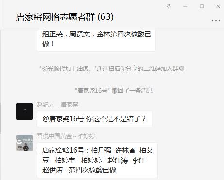 “唐家窯17號全部統(tǒng)計完畢,唐家窯6號第四次核酸已做……”在唐家窯網(wǎng)絡(luò)志愿者群里,志愿者們正在匯報自己對接農(nóng)戶的具體核酸檢測情況。8月2日-8月3日荊劉村第四輪核酸采樣,志愿者通過微信群迅速摸清了采集情況,未落一戶、沒漏一人,做到了底數(shù)清、情況明,全面達到“應(yīng)檢盡檢、應(yīng)采盡采”。