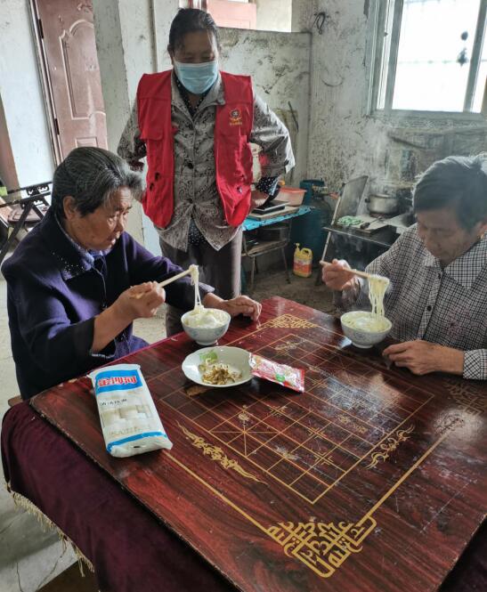 當(dāng)天,志愿者們來到了轄區(qū)內(nèi)的老年人們家中,將帶來的掛面、雞蛋、洗衣液等生活用品送到了他們的手上,同時(shí)祝福他們節(jié)日快樂,也祝愿他們身體健康。在聊天時(shí),志愿者聽到有老人說還沒有吃飯,就熱情地幫他們煮了份面,還打了一個(gè)荷包蛋,讓這碗代表著長(zhǎng)長(zhǎng)久久幸福生活的掛面溫暖老年人的心扉。