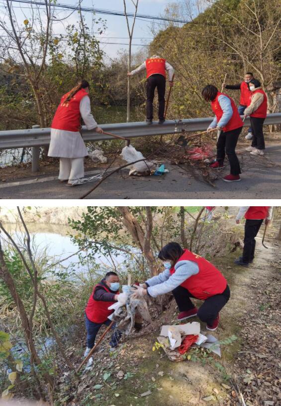 另一組成員將路邊雜亂堆放的垃圾進(jìn)行了清理,把各類垃圾分類裝袋,其他成員則使用竹扒、長竿等工具,對河道、池塘水面上的浮藻、塑料袋、水瓶等進(jìn)行了打撈。