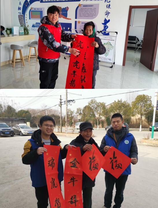 活動現(xiàn)場,飄滿墨香。志愿者們飽含創(chuàng)作熱情,磅礴有力地?fù)]舞毛筆之間,為建設(shè)村村民送上虎年的“頭一份”最美好的祝福?;顒蝇F(xiàn)場的村民一邊感受著過年的喜慶氛圍,一邊贊揚(yáng)著書法家的技藝,迫不及待地排著隊(duì)等著拿大紅的“福”字和春聯(lián)。