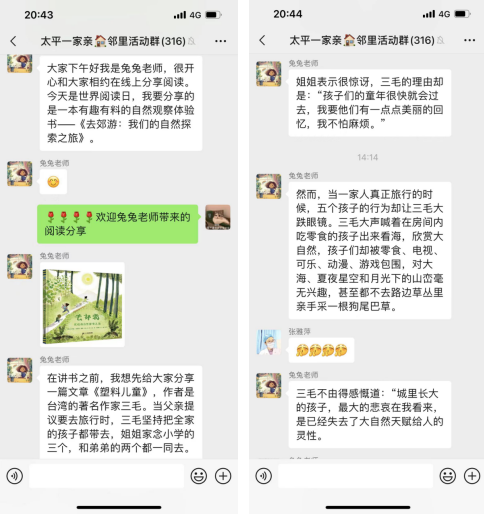 本次活動(dòng)采取“線上”形式,引導(dǎo)居民群眾、特別是父母兒童自行開展閱讀,通過微信群、朋友圈分享閱讀內(nèi)容和閱讀心得,并推薦好書好章節(jié)?;顒?dòng)中,兔兔老師分享臺(tái)灣著名作家三毛所寫的“塑料兒童”這一小故事,并分享了一本超有料的科普新童圖畫書《去郊游》。居民朋友們積極參與,掀起家庭閱讀的熱潮。