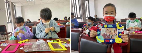 活動最后,志愿者老師帶著孩子手工制作相框,孩子們和家長一起動手,不一會兒漂亮的相框就制作完成,家長與孩子們一同并把帶來的全家福裝進相框,孩子們高興地拿著自己的作品相互分享欣賞。