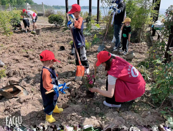 在社區(qū)志愿者俞飛駕駛的“愛飛的俞”愛心叔叔巴士的搭載下,二十余位大小志愿者來到了江邊,在美麗江景的映照下,拉開了當天活動的序幕。志愿者向大家說道:“這次植樹活動可不是裝裝樣子,需要大家拿出自己的體力智力,把我們的小花小樹一起種到規(guī)定的地方”?,F(xiàn)場的同學檔、父子檔、母子檔的志愿者們自動分成7組,帶著小樹苗包括枇杷樹、桃子樹、無花果樹、四季茶樹等等,帶著鐵鍬,彼此配合,你挖一鏟,我挖一鍬,伴隨著鳥啼聲與浪花聲,志愿者們種下了一顆顆小樹苗、一株株小花,它們沐浴在陽光下,飲用著長江水,仿佛正在和我們祖國的花朵們一起茁壯成長。