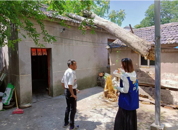 7月11日清晨,家住南京市江寧區(qū)湖熟街道楊柳湖社區(qū)薛家邊的村民薛金明急匆匆地來向社區(qū)反映,家門口的大樹被前一日晚上突襲的10級大風吹倒,壓在了自家廚房上,請社區(qū)幫忙移除大樹。
