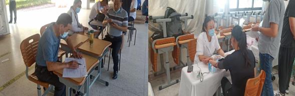 活動當(dāng)天,報名參加活動的黨員和志愿者前往江寧中心小學(xué),高溫天氣,也難以抵擋他們熱忱的心,在醫(yī)護人員的安排下,大家有序進行登記、體檢、測血型等。