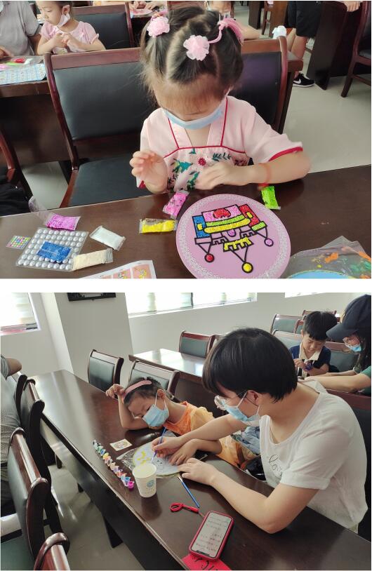 炎炎夏日擋不住孩子們的熱情,他們早早來到社區(qū)活動室?;顒又?,老師給孩子們詳細介紹了扇子的由來、扇子制作材料的變遷,以及扇面繪畫的簡單技巧等。同時為孩子們準備了空白扇子、五彩繽紛的顏料和種類齊全的繪畫工具,給他們普及扇子繪畫的方法和技巧。隨后,孩子們各自挑選了自己喜歡的繪畫圖案,拿起畫筆小心翼翼地沿著圖案線條進行涂色,不一會兒,一幅幅豐富多彩的扇子畫就呈現(xiàn)在大家面前,他們有的畫城堡,有的畫蛋糕,還有的畫小動物……孩子們都非常喜歡自己的畫作,滿臉笑容地拿起扇子和家長們分享展示。