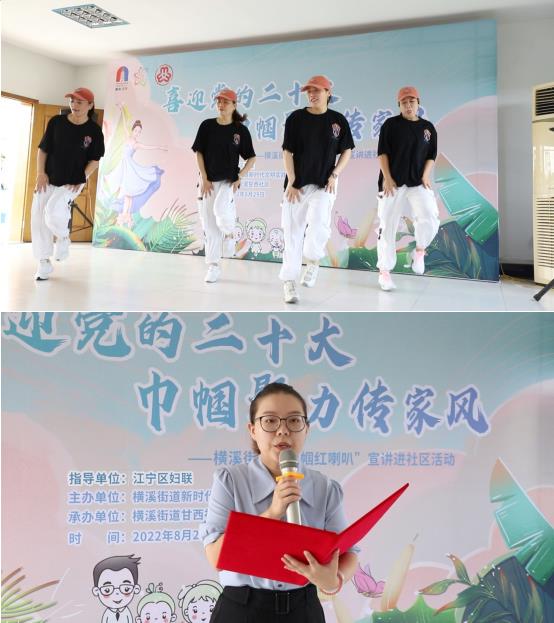 8月29日上午9:30,由南京市江寧區(qū)橫溪街道婦聯(lián)主辦、甘西社區(qū)承辦的“喜迎黨的二十大,巾幗聚力傳家風(fēng)”主題“巾幗紅喇叭”宣講進社區(qū)活動火熱開展,讓黨的“好聲音”飛入尋常百姓家,把黨的號召傳遞到千家萬戶。