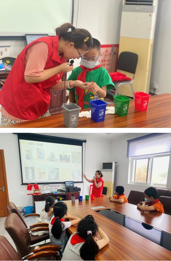 活動室內(nèi)整齊有序地擺放著四色小垃圾桶,志愿者為大家詳解講述了垃圾分類的重要意義,面對面指導孩子們?nèi)绾巫寣ι罾M行區(qū)分,并通過小游戲指導大家將垃圾投放到正確的小垃圾桶中,加深了他們對生活垃圾分類知識的印象,也更好的檢測了大家對于所學知識的掌握程度,并且鼓勵大家在課后多學習垃圾分類知識,帶動身邊人一起分。