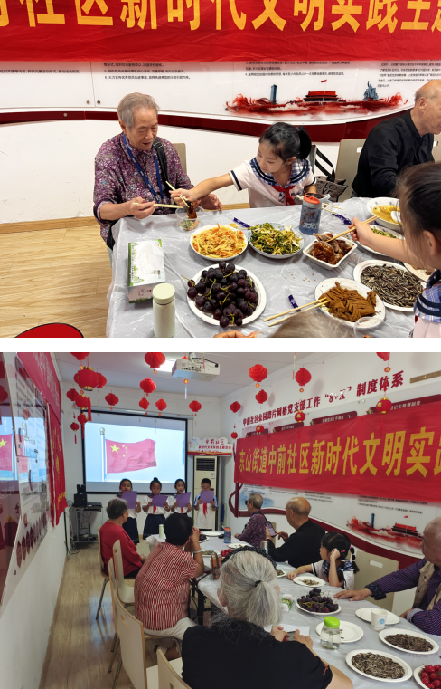 活動(dòng)前夕,志愿者阿姨忙碌地為獨(dú)居老人們準(zhǔn)備了紅燒魚、水煮蝦、清炒西蘭花、青椒土豆絲、玉米排骨湯等種類豐富的菜品。活動(dòng)現(xiàn)場,少先隊(duì)員帶來的表演如詩朗誦《青春禮贊》《會(huì)飛的鞋子》、歌曲《春天在哪里》《孤勇者》、相聲《哥倆好》、舞蹈《茉莉情懷》等引得在場的老人們紛紛鼓掌稱贊。老年代表演唱了戲曲和澎湖灣,最后在少先隊(duì)隊(duì)歌中整場活動(dòng)落下了帷幕。老人們以及小朋友們圍坐在一起吃團(tuán)圓宴,談笑風(fēng)生,節(jié)日氛圍十分濃厚。