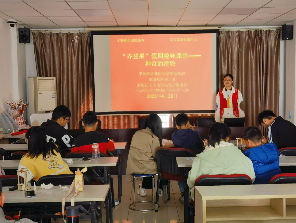 活動(dòng)中,來(lái)自南師大物科院“向心力”志協(xié)的大學(xué)生志愿者們安排好社區(qū)未成年人入座,由講師通過(guò)PPT課件講述滑輪的物理知識(shí)及在日常生活中的常見(jiàn)運(yùn)通。對(duì)于日常運(yùn)用方面,社區(qū)新業(yè)態(tài)新就業(yè)群體的子女相關(guān)觀摩較多,紛紛舉手進(jìn)行了列舉。